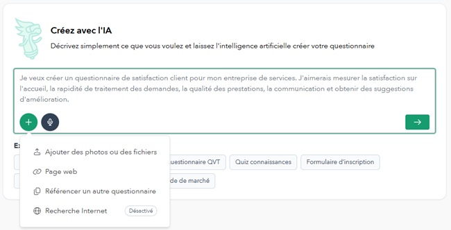 Lorsque vous créez un nouveau questionnaire sur Drag'n Survey, vous pouvez choisir le mode "avec intelligence artificielle". Une zone de texte s'affiche où vous décrivez votre besoin : le sujet de l'enquête, votre public cible, les objectifs que vous poursuivez.