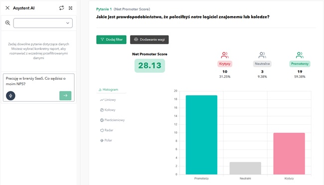 Jeśli Twój NPS wynosi 32, ChatGPT wyjaśni, że to przyzwoity wynik dla handlu detalicznego, ale niewystarczający dla SaaS, i zasugeruje konkretne obszary poprawy na podstawie wypowiedzi Twoich krytyków.