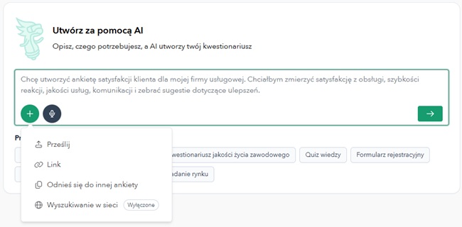 - Błyskawiczne tworzenie: opisz swoją potrzebę, ChatGPT wygeneruje ankietę